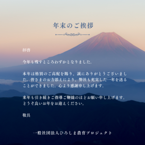 お知らせ 年末のご挨拶 2025.12.30 本年も格別のご高配を賜り、誠にありがとうございました。 2026年は一層精進し、地域貢献・地域農業の振興と子育て支援に全力で走りぬく所存です! 来年もご指導ご鞭撻のほどよろしくお願い申し上げます。 皆さまも良いお年をお迎えください♪ Post Share